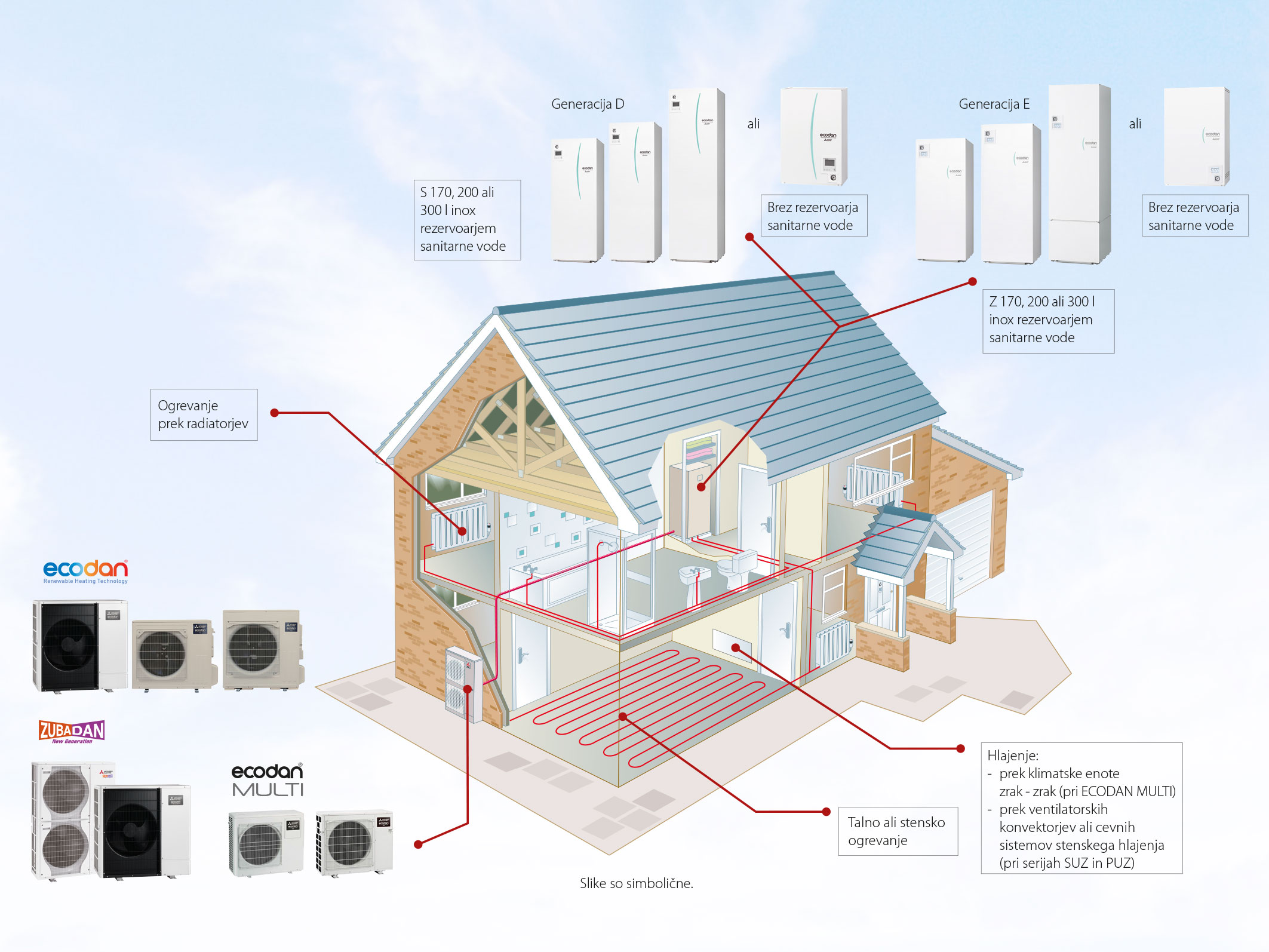 Mitsubishi Electric ponuja na izbiro toplotne črpalke zrak- voda Ecodan in Zubadan, dve seriji zunanjih enot s širokim naborom modelov glede na nazivno moč, pripravo sanitarne tople vode in možnost hlajenja poleti. Ključna razlika med serijama je učinkovitost ogrevanja pri zunanjih temperaturah.