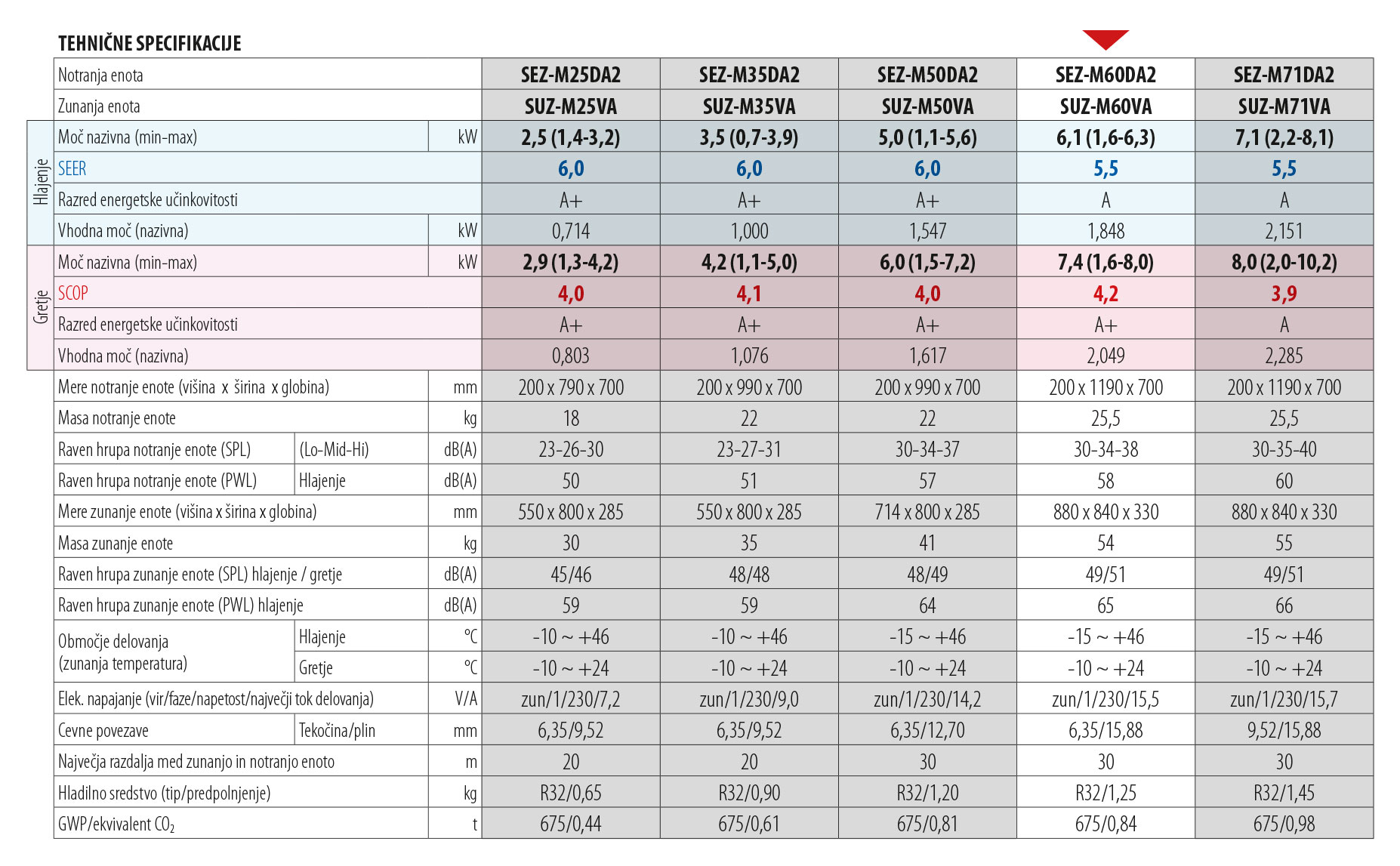 Osnovni tehnični podatki: SEZ-M60DA2/SUZ-M60VA