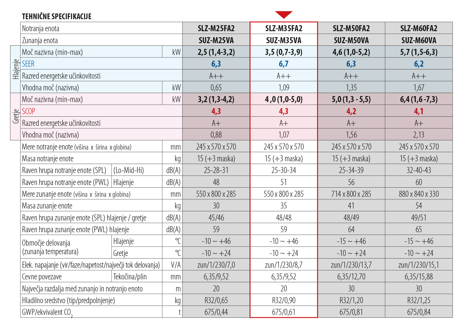 Osnovni tehnični podatki: SLZ-M35FA2/SUZ-M35VA