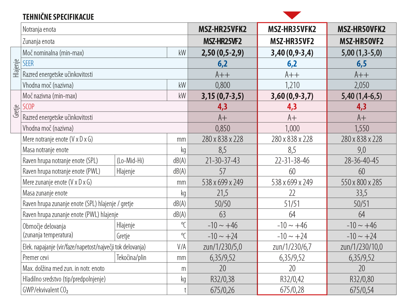 Osnovni tehnični podatki: MSZ-HR35VF2/MUZ-HR35VF2