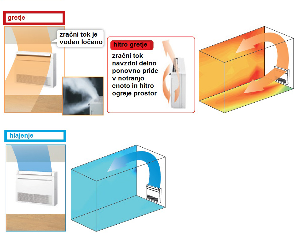 Talna namestitev klimatske naprave omogoča rešitev hlajenja in ogrevanja prostora tudi v prostorih, kjer smo omejeni s prostorom na steni. A to ni edina prednost tega modela. Novi model talne klimatske naprave vsebuje plin R32, ki je okolju še prijaznejši kot njen predhodni model, ki je vseboval plin R410A. Naprava ima visok energijski izkoristek, v načinu hlajenja se uvršča v energijski razred A++, v načinu gretja pa A+.